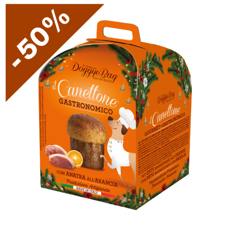 Il Canettone Gastronomico è un gustoso "panettone" per festeggiare insieme al tuo cucciolone la Gioia del Natale! La ricetta con anatra all'arancia è una proposta unica e prelibata, formulata appositamente per il tuo amico a quattro zampe e ha una consistenza che asseconda la sua masticazione. È un prodotto artigianale da forno lievitato naturalmente. È proposto in un elegante e raffinato bauletto natalizio.